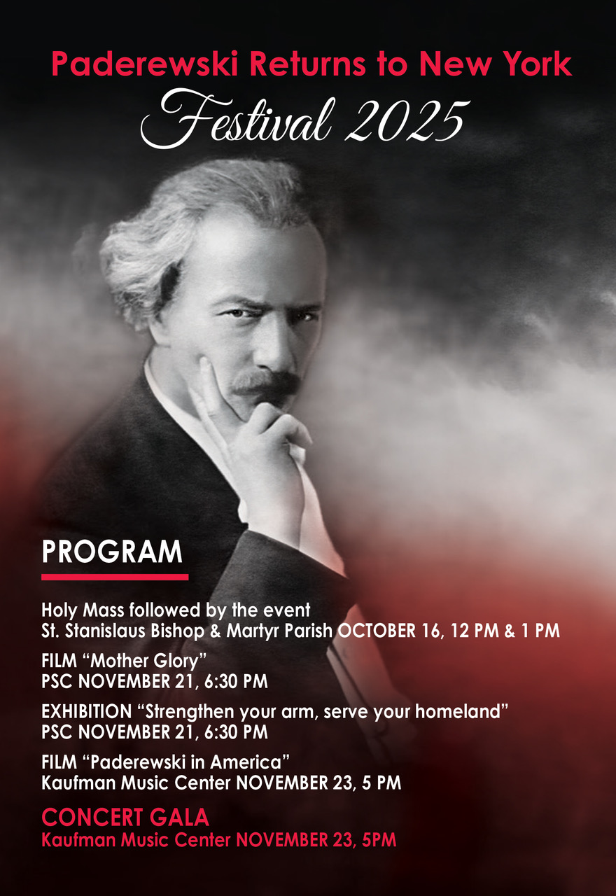 Będę wdzięczna za informację czy jest możliwość organizacji lekcji dedykowanej Ignacemu Paderewskiemu w Państwa szkole, jeżeli tak, to kiedy lekcja mogłaby się odbyć. Mogę udostępnić link do prezentacji filmu "Paderewski in America" jak również wystawę, "Paderewski Returns to America", którą można odebrać z Centrum Polsko- Słowiańskiego na Greenpoincie. (13 plansz formatu 100 x 70 cm). W dobie zanikających autorytetów warto wskazać wartości do których młodzież powinna się odwoływać. Program Festiwalu Ignacego Paderewskiego 2025 9 października 2025, godz. 5.30 pm Centrum Polsko-Słowiańskie (CPS) Podczas Dnia Dziedzictwa Polskiego w Centrum Polsko-Słowiańskim z udziałem Polonii, gości VIP i przedstawicieli władz miasta Nowy Jork odbędzie się premiera wystawy "Paderewski in America" Jest to opowieść o artyście, mężu stanu i patriocie, który zdobył serca Amerykanów i na trwałe wpisał się w historię Polski i świata. Inauguracja Festiwalu będzie okazją do wspólnego świętowania polskiego dziedzictwa oraz wyjątkową lekcją historii, kultury i dumy narodowej. 16 listopada 2025, godz.12.00, 13.00 Msz Św. w intencji wielkiego Polaka, po której odbędzie się spotkanie z prezentacją wystawy i projekcją filmu o Ignacym Paderewskim w Ameryce. W ramach Festiwalu odbędą się również lekcje nowoczesnego patriotyzmu w niektórych Polskich Szkołach Dokształcających. 21 listopada 2025, godz. 6.30 pm Film „Mother Glory” (Dla Ojczyzny Chwały), fabularyzowany dokument w reżyserii Franciszka Kłosowicza, sekretarza generalnego „Sokoła” w latach 1925–1940. Nakręcony na taśmie 35 mm z okazji 15-lecia rekrutacji do Armii Polskiej we Francji, film ukazuje polskich ochotników z obozu Tadeusza Kościuszki w Niagara-on-the-Lake w Kanadzie, którzy walczyli o niepodległość Polski. Projekcja pozwala spotkać się z historią sprzed ponad wieku dzięki oryginalnym obrazom filmowym. Obie prezentacje przygotował Instytut Pamięci Narodowej (IPN) 23 listopada 2025, godz. 5pm. Kaufman Music Center, Manhattan Kulminacją tegorocznego festiwalu będzie Gala koncertowa z udziałem międzynarodowych artystów, którą otworzy Prezes Instytutu Pamięci Narodowej. W programie wieczoru utwory Paderewskiego, Chopina, Wieniawskiego, Liszta, Brahmsa i Sarasatego, a także film dokumentalny "Paderewski in America" Gala będzie hołdem dla artysty i męża stanu, który łączył muzykę z polityką, sztukę z patriotyzmem oraz talent z misją służby Polsce. Festiwal Ignacego Paderewskiego odbywa się pod Patronatem Honorowym Ambasadora Krzysztofa Szczerskiego - Stałego Przedstawiciela RP przy ONZ w Nowym Jorku, Mateusza Sakowicza, Konsula Generalnego Rzeczypospolitej Polskiej w Nowym Jorku, Centrum im. Ignacego Paderewskiego w Kąśnej Dolnej, jedynej zachowanej rezydencji Ignacego Jana Paderewskiego na świecie. Partnerzy: Muzeum Polskie w Ameryce, The Sembrich – Fundacja Marcelli Sembrich, Centrum Polsko-Słowiańskie, Polish American WE. Patronat: Steinway & Sons Company, Instytut Józefa Piłsudskiego w Ameryce, Polski Instytut Naukowy w Ameryce (PIASA).
