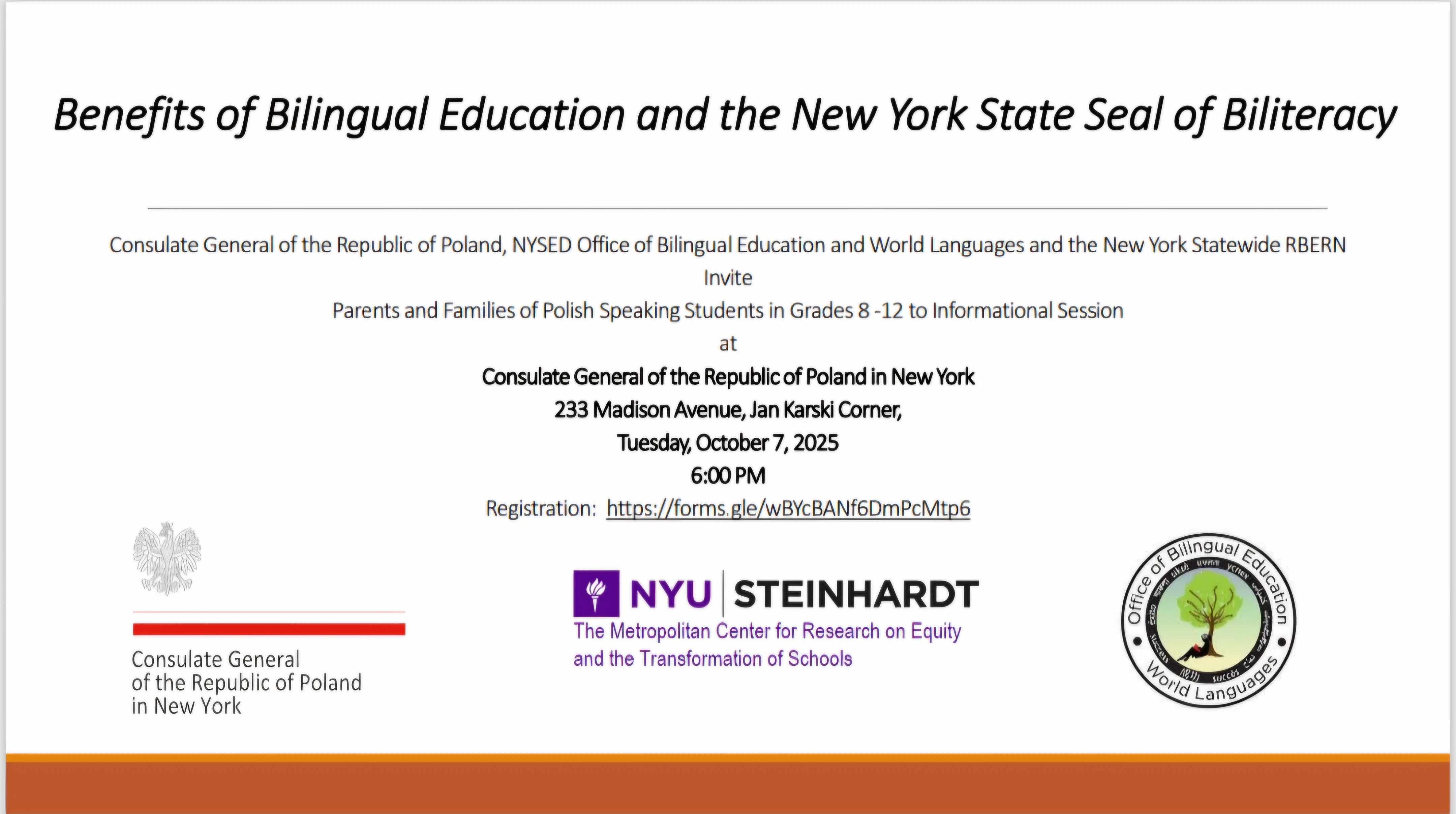 Konsulat Generalny RP w Nowym Jorku, Biuro Edukacji Dwujęzycznej i Języków Świata Departamentu Edukacji Stanu Nowy Jork oraz Regionalna Sieć Zasobów Edukacji Dwujęzycznej Stanu Nowy Jork, zapraszają rodziców i rodziny uczniów mówiących po polsku w klasach 8-12 na spotkanie informacyjne nt. korzyści płynących z Edukacji Dwujęzycznej i Pieczęci Dwujęzyczności Stanu Nowy Jork. Spotkanie odbędzie się w siedzibie konsulatu Generalnego RP w Nowym Jorku w dniu 7 października 2025 r. o godz. 18:00.
