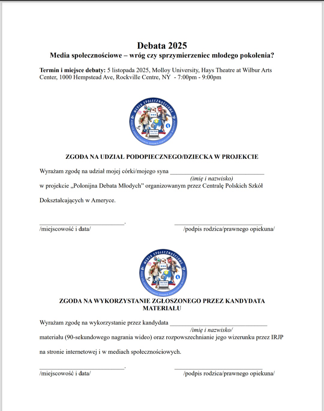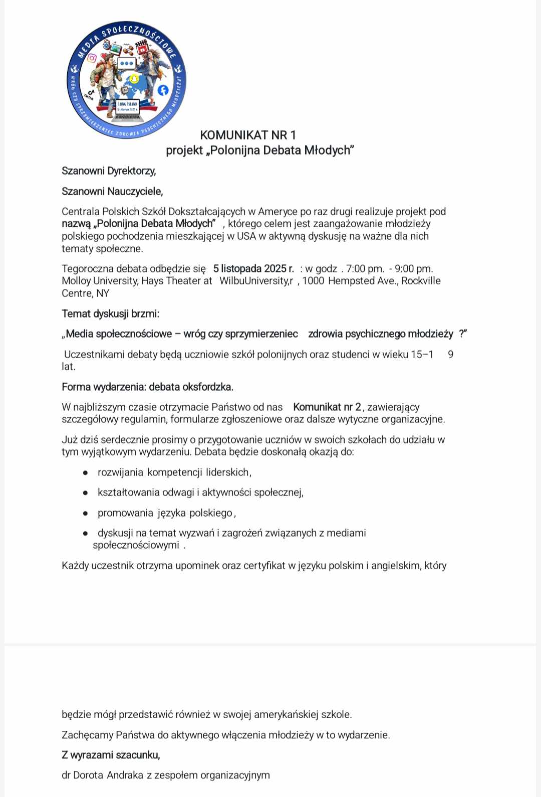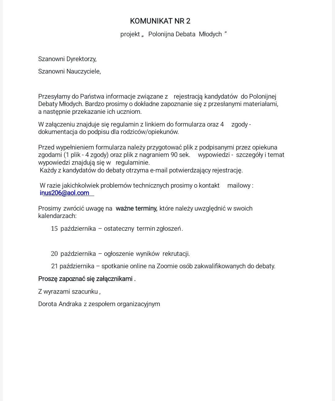 Ogłoszenie 2! Załącznik nr 1: Załącznik nr 2: 2025-10-05 10:05:38 ET   Ogłoszenie! 1 Załącznik nr 1: Załącznik nr 2: Załącznik nr 3: 2025-10-05 10:04:30 ET   Zaproszenie. 📅 6 października 2025 r. o godz. 18:00 ET zapraszamy uczniów szkół polonijnych na webinar poświęcony przygotowaniu eseju rekrutacyjnego. W trakcie spotkania uczestnicy: 👉 Zapisz się tutaj: www.polishyouth.org/essayswebinar Z poważaniem, e. weronika.kosciolek@polishyouth.org 2025-10-02 22:13:03 ET   Ogłoszenie! Załącznik nr 1: 2025-10-02 22:12:04 ET   Ogłoszenie! Załącznik nr 1: Załącznik nr 2: 2025-09-25 18:38:56 ET