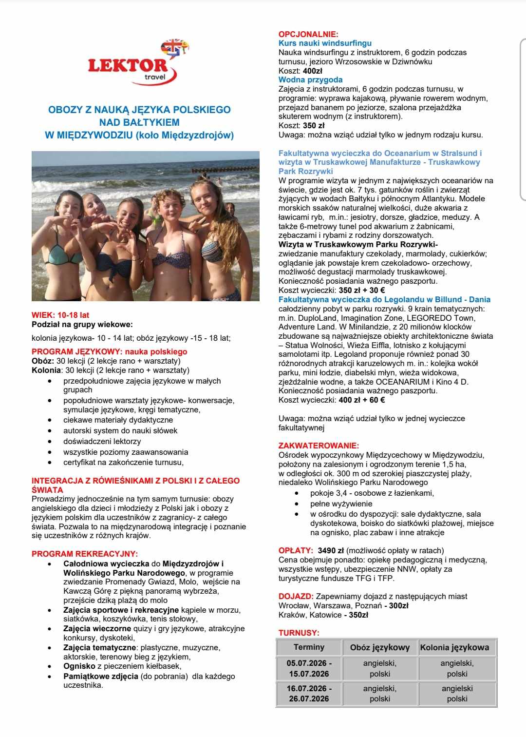 Przesyłamy Państwu ofertę kolonii i obozów językowych w Polsce dla dzieci i młodzieży organizowanych nad morzem w Międzywodziu (koło Międzyzdrojów) w okresie wakacji.