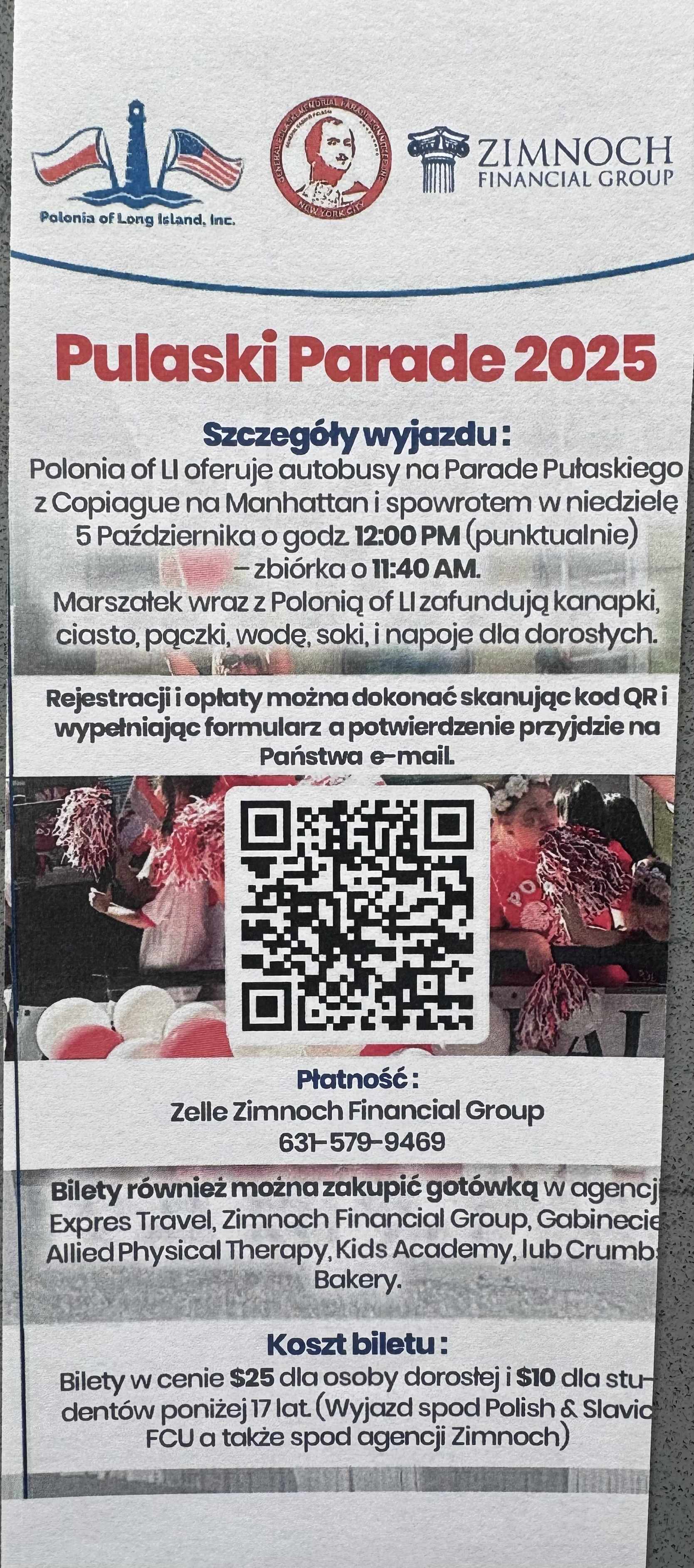 Serdecznie zapraszam na Paradę Pulaskiego, która już za tydzień, w niedzielę 5 października. Polonia of Long Island oferuje autobusy- wszystkie informacje dotyczące parady i zakupu biletów na autobus znajdziecie Państwo w załączonych ulotkach.