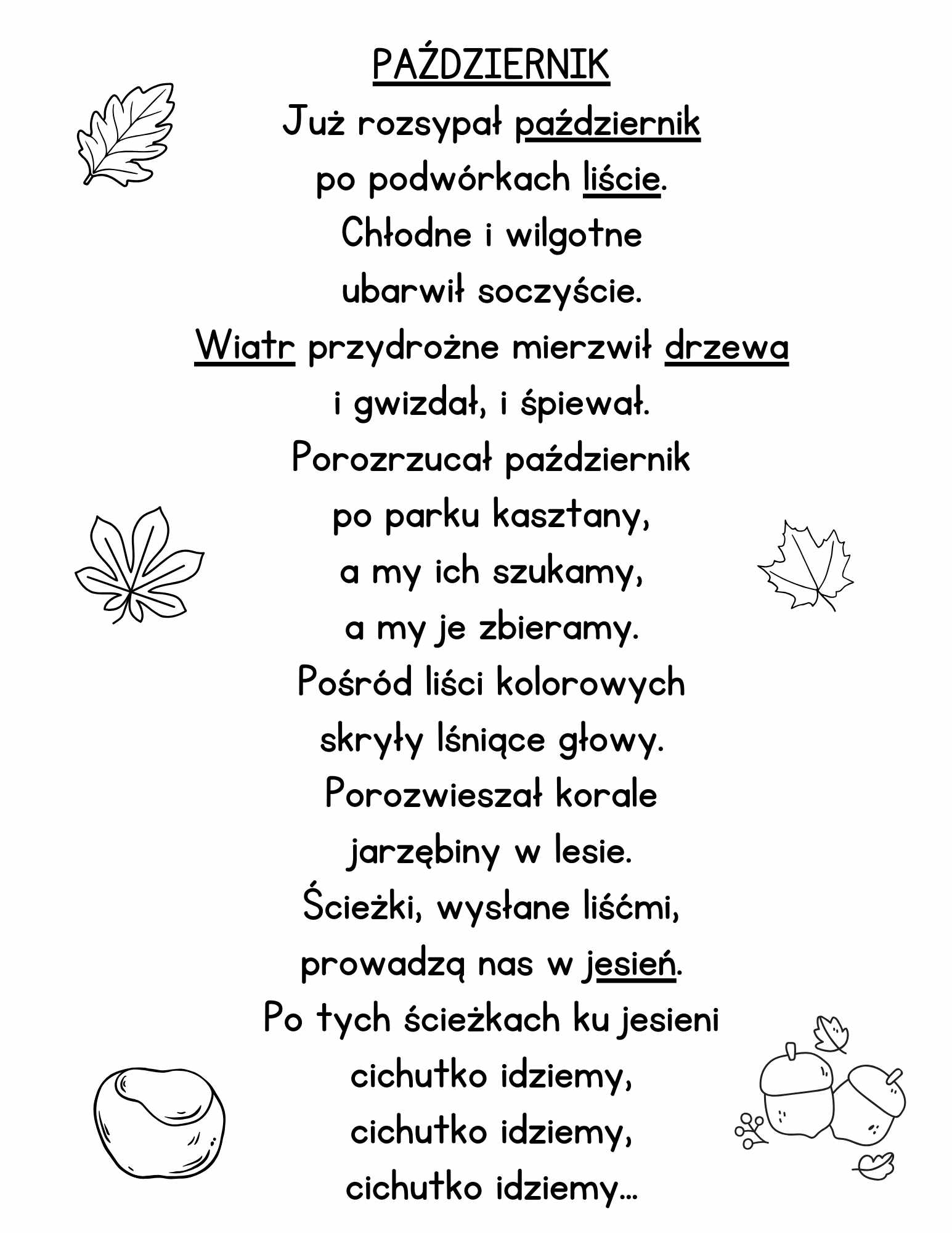 • Ułóż i zapisz w zeszycie 5 zdań z wyrazami podkreślonymi w wierszu „Październik” (wklejony do zeszytu)